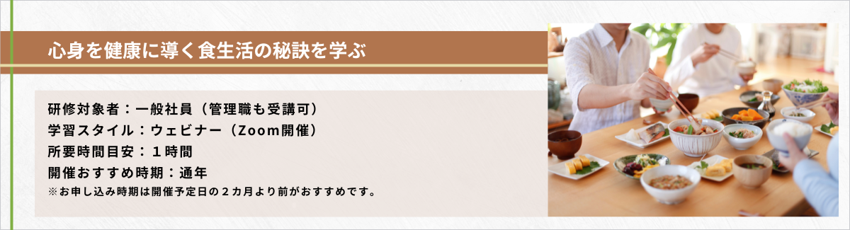| 研修の内容 | 1)食生活とメンタルヘルスの関係 ー 食生活のウソ、ホントを正しく理解 ー 心身を健康に導く食生活とは 2)食生活セルフチェック ー 日頃の食生活を振り返る ー 意識して取りたい食材・栄養素を知る 3)質の良い睡眠を得るための食生活 ー 食べる時間の工夫で睡眠の質を高める ー 生活リズムが整う食習慣を取り入れる |