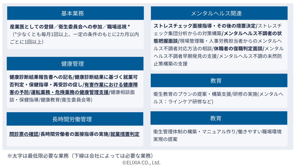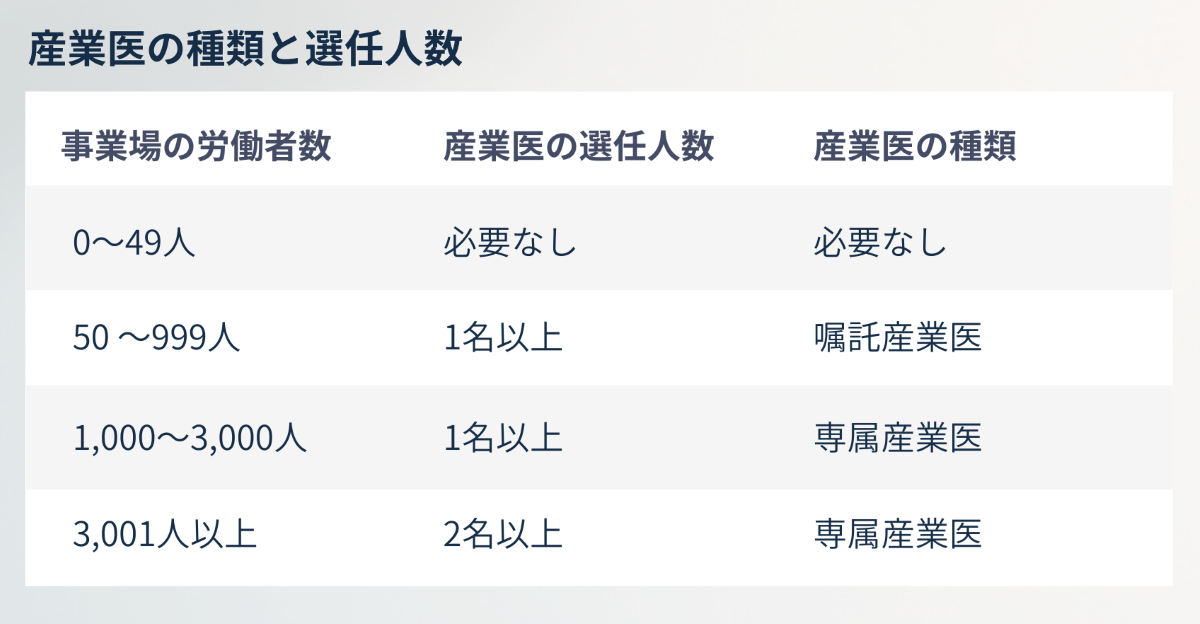 失敗しない産業医の選び方|①産業医選任の考え方と準備 2026/02/02 2026/02/02 産業保健コラム はじめに―初めてでも迷わない。産業医選任の全体像と、検討を進めるためにやること 「産業医を選ばないといけなくなったけど、何から始める?」「何を基準に産業医を選べばいい?」という疑問はありませんか。 産業医の選任は常時50人以上の労働者が働く事業場で義務とされています。しかし、人事としてゼロベースで産業医選任を経験する機会は決して多くなく、“自社に合った産業医”の判断基準はつかみにくいものです。 近年は、メンタルヘルス対応や特性への配慮が必要なケース、ハラスメントに関連した相談、リモートワークの増加に伴う健康課題など、企業が抱える問題が多様化していることで、産業医に求められる役割そのものが大きく広がってきています。 まずは自社の課題を整理し、そのうえで「自社に合う産業医」を選ぶ視点が大切になります。 本シリーズでは、3回にわたって、産業医の基本知識や選任のポイント、選任の進め方を整理しました。1回目の本記事は産業医選任に向けた準備のポイントについて解説しています。ぜひ最後までお読みいただき、産業医選任の際にお役立てください。 この記事でわかること(目次)はじめに―初めてでも迷わない。産業医選任の全体像と、検討を進めるためにやることそもそも産業医とは?—役割・種類・選任の基本産業医が担う役割と法令で決まっていること産業医の種類と選任人数の基準産業医選任でなぜ迷うのか迷わないための選任プロセス自社の困りごとを棚卸する課題整理のやり方―“求める関わり方”が自然に見えてくるまとめ―“課題から始める”ことで迷わず選べるすべて表示 この記事でわかること(目次)はじめに―初めてでも迷わない。産業医選任の全体像と、検討を進めるためにやることそもそも産業医とは?—役割・種類・選任の基本産業医が担う役割と法令で決まっていること産業医の種類と選任人数の基準自社に合った産業医とは?—迷いを減らす考え方産業医選任でなぜ迷うのか迷わないための選任プロセス自社の困りごとを棚卸する課題整理のやり方―“求める関わり方”が自然に見えてくるまとめ―“課題から始める”ことで迷わず選べるそもそも産業医とは?—役割・種類・選任の基本 産業医の選任をする前にまず押さえておきたいのは、産業医の役割です。産業医について知ることで、依頼できることや、関わり方などがイメージしやすくなり、選任プロセスも進めやすくなります。 ※産業医についてすでにご存じの方は、次の章からお読みください。 産業医が担う役割と法令で決まっていること 産業医とは、職場で従業員が安全に、快適に仕事ができるように、専門的な立場から指導、助言する医師です。50人以上の従業員がいる※1事業場※2は産業医の選任が法律で義務付けられています。 ※1 「50人以上」とは常時使用する労働者であり、パートやアルバイト、派遣社員なども含む。※2 「事業場」とは、一定の場所で継続的に業務が行われる単位を指し、同じ会社であっても支店や店舗ごとに1事業場として扱われます。 産業医の主な業務内容は以下です。 産業医の種類と選任人数の基準 産業医の選任人数や種類は、事業場の労働者数や業種で定められています。(労働安全衛生法および労働安全衛生規則)。 ※一定の有害業務に常時500人以上の労働者を従事させる事業所は専属産業医の選任が必要です。※対象となる労働者数には、正社員だけでなく契約社員や派遣社員、パート、アルバイトも含まれます。 産業医は嘱託産業医と専属産業医があります。嘱託産業医と専属産業医の主な違いは勤務形態にあります。 嘱託産業医は、非常勤となり、常時事業場にはいません。訪問頻度は、月1回から数回で、1時間~2時間程度事業場に訪問します。嘱託産業医には、産業医のみで活動している医師もいれば、病院勤務や研究職と兼務している医師もいます。 専属産業医は常勤として事業場に勤務する医師で、週3~5日、1日3時間以上など一定時間勤務する形が一般的です。 次章では、これら基本知識を踏まえつつ、最初のつまずきやすいポイントとして、「実際に産業医を選任するときはどんな考え方で進めればいいのか」について解説していきます。 産業医とは何か、もっと基礎的な内容について知りたい方は以下のコラムで詳しく解説しています。産業医とは?はじめての選任 探し方、相場、届出の基本 「記事を全文読みきりたいけど、時間がない!」という方必見 「産業医選びの新常識ガイド」本資料では、産業医の選び方を具体例豊富に説明しつつ、表や図などで短時間でもわかりやすいように全13ページでまとめました。また、自社の課題や体制に合う産業医タイプをもっと選びやすいように「フローチャート」を掲載しています。ぜひチェックしてみてください。ダウンロードはこちら 自社に合った産業医とは?—迷いを減らす考え