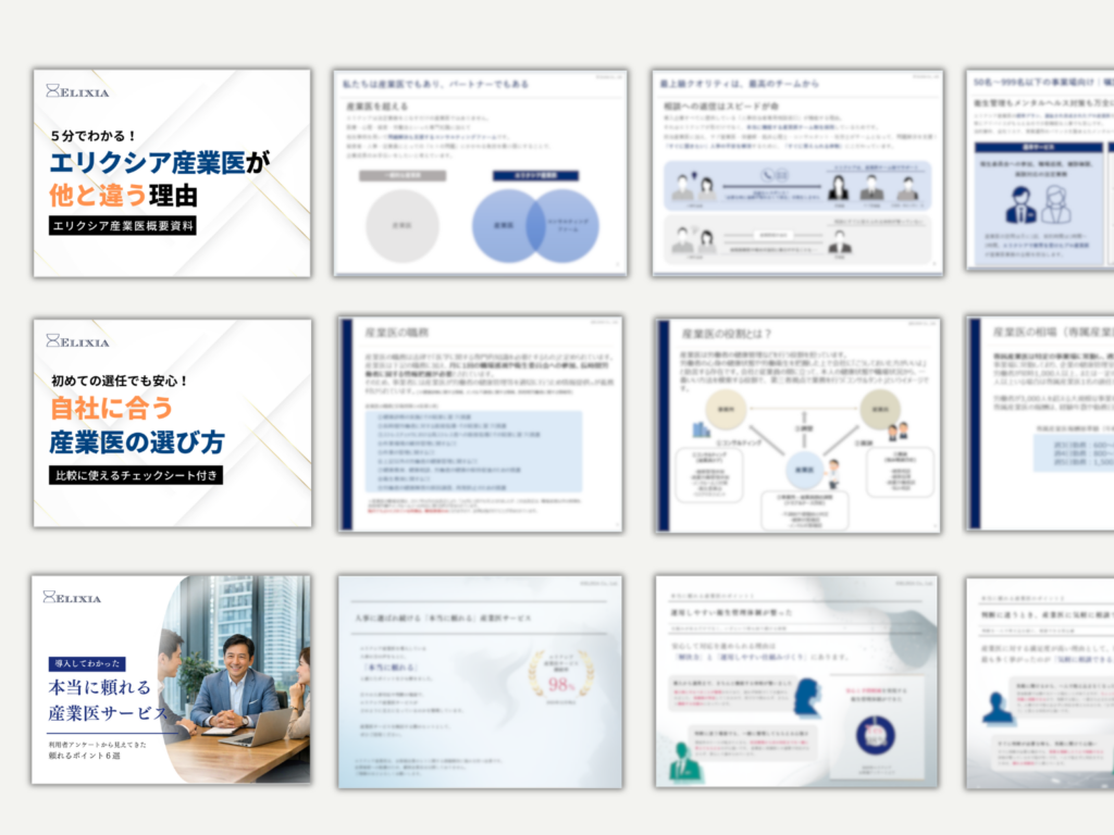 よくある質問 エリクシア産業医の強みと特徴 産業医業務について ご相談内容について 料金について ご契約までの流れ Q すでに産業医がいる場合でも、体制の見直しや役割設計について相談できますか? はい、ご相談可能です。 実際に、現地での実務対応(衛生委員会参加、健康診断結果の確認、職場巡視)は既存の産業医が行い、不調者対応(面談、個別相談対応、フロー設計)をエリクシアが担当しているケースもございます。 エリクシアでは、現在の体制やご状況を踏まえながら、どこまでを既存の産業医が担い、どこをエリクシアが担うのかといった役割分担や整理を行い、無理なく運用が回る形への見直しをご提案しています。 Q 産業医は選べますか? 男性/女性のご希望はお伺いいたします。弊社のサービスは登録派遣型ではありませんので、貴社のご状況と産業医の空き状況を確認したうえで、貴社に最適な産業医を選任させて頂きます。産業医は自社採用しており、教育を受けたプロフェッショナルのみが在籍しています。 Q 英語での対応は可能ですか? はい、英語での対応が可能な産業医も在籍しています。 エリクシアでは、英語での面談に対応可能な産業医が在籍しており、ご希望に応じて対応しています。外資系企業の日本法人での支援実績もございます。 なお、産業保健業務は日本の法令に基づいて実施されるため、制度や書式は日本基準での対応となります。 Q 訪問時間内でどのような業務を行いますか。 産業医は訪問時間内で、<衛生委員会への参加、職場巡視、健康診断結果の確認、過重労働問診票の確認、面談対応、従業員対応に関する人事相談対応>などを行います。 Q 産業医業務はオンラインで対応してもらうことはできますか? はい、産業医業務はオンラインでの対応が可能です。 面談や人事からのご相談、打ち合わせなどはオンラインでの対応もしております。一方で、産業医の業務の中には、法令や業務の性質上、現地での対応が求められるものもあります。 例えば、職場巡視は実際の作業環境を確認する必要があるため、訪問での実施が基本となります。 エリクシアでは、企業の体制や拠点状況、業務内容などを踏まえながら、どの業務をオンラインで実施し、どの業務は訪問で行うべきかを整理し、最適な運用方法をご提案しています。 Q 契約後はどのようなサポートをしてもらえますか? 導入後はまず初めに、担当保健師がサービスのご利用方法や衛生管理業務についてご説明いたします。衛生委員会の立ち上げ方や進め方、職場巡視の方法、健康管理や過重労働管理の方法、休職・復職対応など、一つひとつマニュアルを用いながらご説明します。 運用時に必要な書式は、テンプレート・ひな形をご用意しています。 お客様のご状況に合わせた運用方法を、他社事例も交えてアドバイスさせていただきます。 Q 年間計画や各種書式のテンプレートは提供してもらえますか? はい、ご用意しています。 産業保健の運用を進める中で、「どのような書式を用意すべきか」「自社でどこまで整備する必要があるのか」といった点に悩まれるケースも少なくありません。 安全衛生年間計画や心の健康づくり計画、衛生委員会の議事録や職場巡視チェックリスト、過重労働問診票、人事面談報告書、休職・復職関連書類など、産業保健業務に必要な書式は一式ご提供可能です。書式を一から作成する負担を減らし、運用をスムーズに立ち上げることができます。 また、衛生委員会テーマ例や、衛生委員会で使えるテーマ資料、従業員向け周知資料もご提供しています。 Q 衛生委員会の立上げはサポートしてもらえますか? はい、サポートしております。衛生委員の選定基準や委員会での報告内容・テーマ選定のポイント、議事録の管理方法など、委員会運営の基本について、マニュアルを用いながらご説明させていただき、立上げを支援します。 Q ストレスチェックは契約内でお願いできますか? ストレスチェックはオプションサービスとなります。独自の従業員意識調査型ストレスチェック『ココロモニター』のご案内が可能です。「やって終わり」ではなく、ストレスチェックの集団結果を「人事施策に活かしていきたい」、「離職や不調者が多い部署の課題を見つけたい」といったご要望をお持ちの企業にお勧めです。 Q 従業員が直接利用できる相談窓口はありますか? 個別従業員からのメールや電話を通じた相談窓口サービスはご提供しておりません。ハラスメント外部窓口に関しては、産業医契約を頂いているお客様限定でご提供しております。 Q 産業医面談の内容は会社にどこまで共有されますか? 本人が同意した範囲の内容および産業医の意見を共有いたします。 <意見書の内容 例> ・本人の状態(本人同意の範囲での内容にとどまる) ・産業医としての意見(就業可否、業務上配慮事項に関する意見) ・会社対応(様子見、就業制限、次回面談の目安など推奨される対応を記載) 「面談内容そのも
