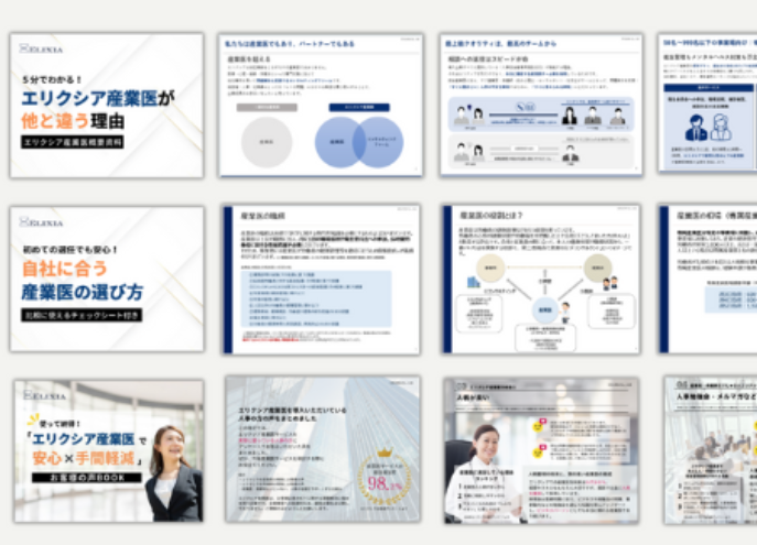 産業保健や健康管理について大事な情報がすぐ手に入る。専門家も使っているチェックリストやフォーマットもお手元で確認。人事のお仕事に役立つ資料を集めました。 エリクシアがわかる資料3点セット |資料3点セット| エリクシア産業医が他と違う理由(エリクシア産業医概要資料)自社に合う産業医の選び方エリクシア産業医で安心×手間軽減―お客様の声BOOK エリクシア産業医のサービスがわかる!はじめての産業医の選任でも産業医の切り替え時にも役立つチェックリストつきの資料もご用意しました。 ダウンロードする 産業保健・健康管理お役立ちノウハウ資料 ダウンロードする ダウンロードする ダウンロードする ダウンロードする ダウンロードする ダウンロードする セミナー情報 問い合わせる